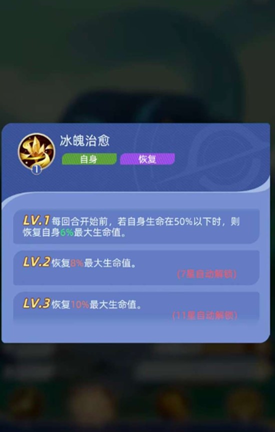 在生存与续航方面,泰斯特拉拥有冰魄治愈技能。当自身生命值低于50%时,他能在回合开始前恢复一定比例的最大生命值。这个回复比例会随着技能等级提升而增加,最高可在11星时达到恢复10%最大生命值的效果,这大大增强了他在神召大陆战斗中的持续作战能力。