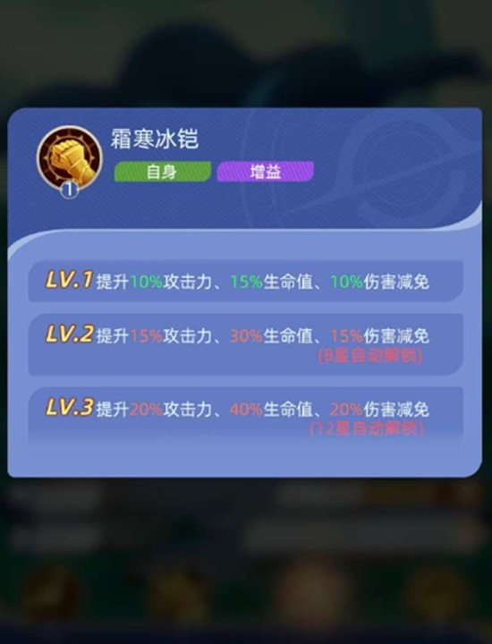 泰斯特拉的被动技能霜寒冰铠能为他自身提供可观的属性增益,包括攻击力、生命值与伤害减免的百分比提升。该增益效果会随着技能等级提升而强化,在12星时可达到最高数值。虽然此增益仅作用于自身,但全面的属性提升让泰斯特拉在神召大陆的战场上能攻能守,站场能力十分出色。