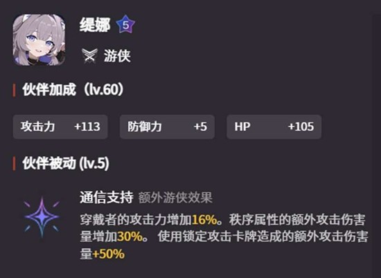 除了主战员,一些辅战员也能为队伍提供强大的额外攻击增幅。五星辅战员缇娜就是一个突出的例子。她的被动技能“通信支持”不仅能提升穿戴者16%的攻击力,还能让秩序属性的角色获得的额外攻击伤害量提高30%。更关键的是,她还能使锁定攻击卡牌所造成的额外攻击伤害提升50%。这使得缇娜的技能组与雨果的机制完美契合,将他们组合在同一队伍中,可以极大地提升整个队伍在卡厄思梦境战斗中的输出上限。