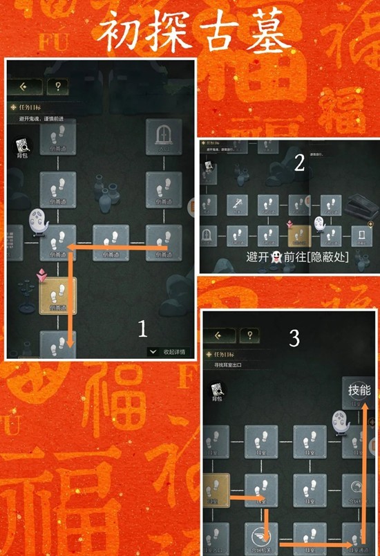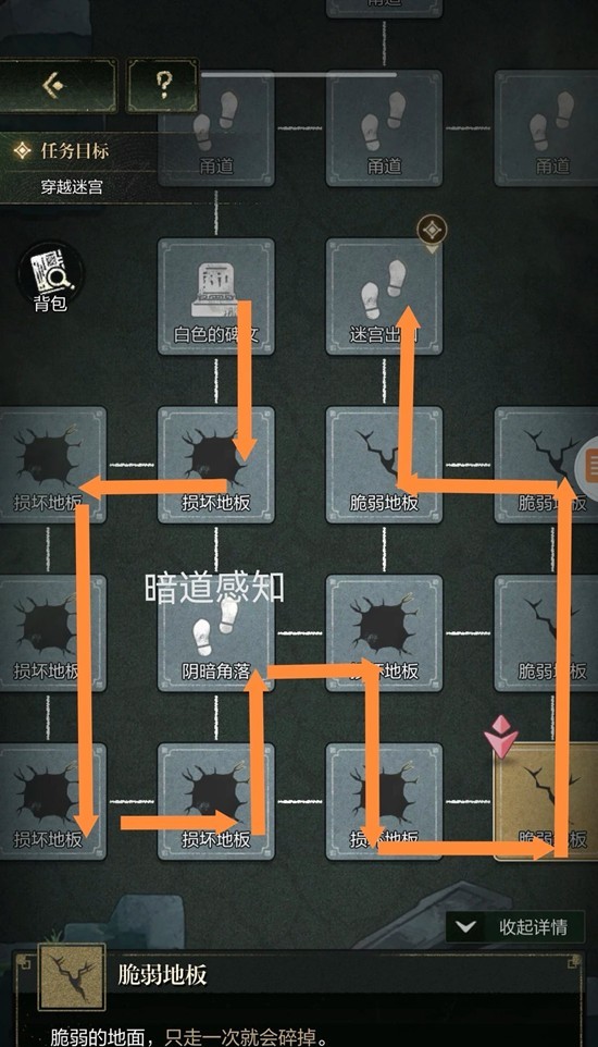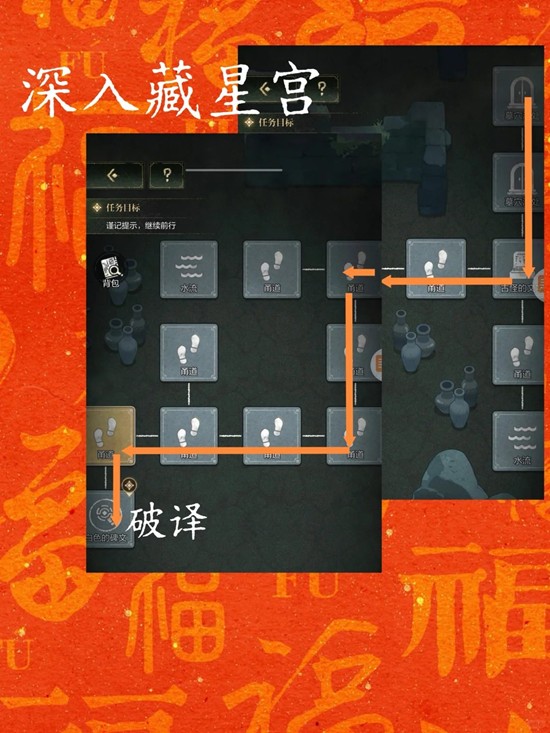 六宫格探索藏星宫主墓室。只要失败就会重新走过当前路线,所以避免鬼打墙先看一下任务条和地图特征~