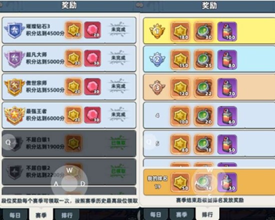 第二个是赛季段位奖励,根据玩家在整个赛季中达到的历史最高段位进行发放,每个赛季只能领取一次。奖励以荣耀金币和钻石为主,段位越高,获得的量就越大。第三个是赛季排行奖励,在赛季结束时,会根据玩家的最终积分排名进行发放,奖励同样包含荣耀金币和寻宝探测器。