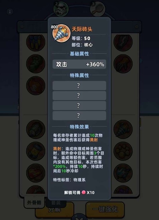 天际砖头的效果非常强大。它的特殊效果触发需要前置条件:每名幸存者需要累计造成10次物理伤害或10次神圣伤害。当条件达成后,该幸存者将获得“溅射”能力。此后,当这名幸存者造成物理或神圣伤害时,会额外命中周边随机3名目标,并对这3个目标造成与主目标等额的伤害。如果周边没有其他目标可供溅射,那么幸存者对主目标的伤害倍率则会提升至200%。这个效果让它在应对单体首领或群体怪物时都非常出色。