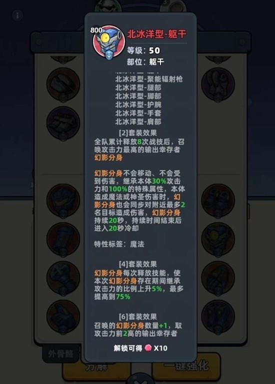在外骨骼的搭配上,推荐采用北冰洋六件套和擎天型二件套作为外圈配装。擎天型二件套的效果能为玩家提供能量块,从而获得高倍率的物理伤害加成。北冰洋六件套的“幻影分身”效果,则可以有效强化幸存者的输出能力,这对依靠物理或神圣伤害的角色提升显著,与天际砖头的适配度极高。