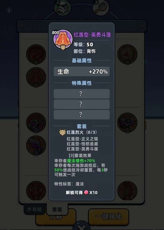 内圈配装则更推荐使用红莲型三件套。这套装备有50%的概率在幸存者释放战技后立刻重置其冷却时间,且每3秒就能触发一次。这个效果能让幸存者更频繁地施放技能,打出更多的物理或神圣伤害,从而更快地满足触发天际砖头“溅射”能力所需的前置条件,形成高效的输出循环。