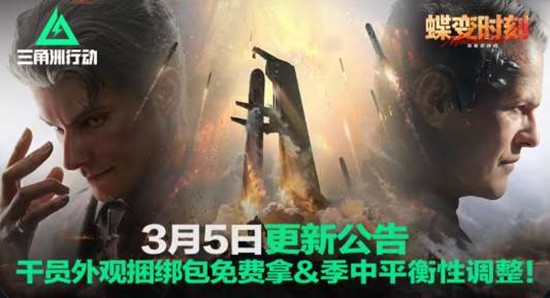 干员们注意!《三角洲行动》于3月5日(今日)进行不停机更新,更新期间不影响正常游玩与匹配。本次更新带来重磅福利——干员外观捆绑包免费拿,同时实装赛季中大规模平衡性调整,涵盖武器、干员及地图优化,更有多项新活动同步上线!