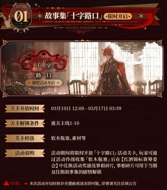 3月10日,让我们在「十字路口」相遇,见证干员们的抉择与成长。更多活动内容请持续关注《明日方舟》游戏内公告及官方社交媒体。祝各位博士寻访顺利!