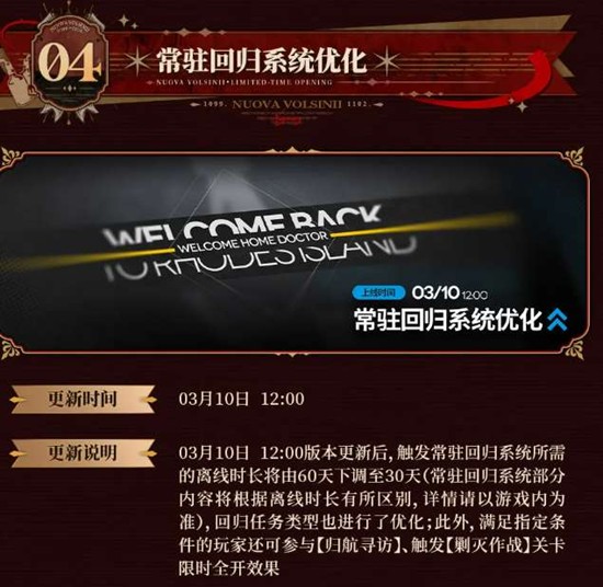本次更新将对常驻回归系统进行优化调整,改善回归博士的游戏体验,提供更完善的回归指引与奖励机制,帮助重返战场的博士快速适应最新环境。