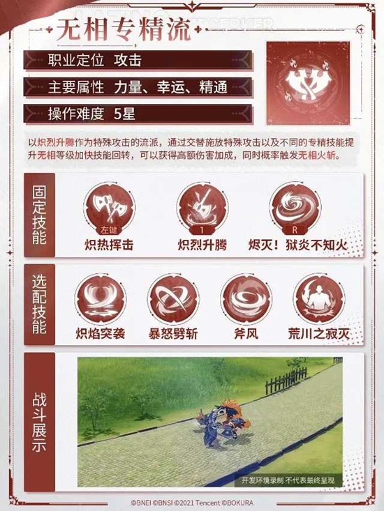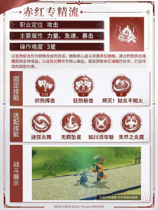 战斗特色:以「狂热斩击」作为特殊攻击手段,通过积攒赤红魂槽获得各类增益。核心输出技能「迷狂炎舞」能高效获取魂槽资源,配合「无羁坠星」、「如川流华斩」、「无尽之炎魔」等选配技能,打出持续稳定的高额伤害。