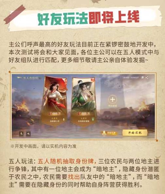 3月18日「再牌一把」终极测试火热招募中好友玩法即将上线:五人身份场开启社交新体验,本次测试最受期待的好友组队功能终于亮相!玩家期待已久的社交玩法正在紧锣密鼓开发中,将在本次测试与各位主公正式见面。