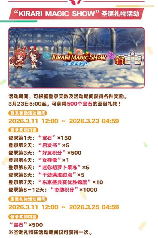 3月11日,让我们一同期待"KIRARI MAGIC SHOW"的华丽开幕,与心爱的优俊少女们共同书写这个圣诞的魔法篇章吧!训练员们,准备好了吗?