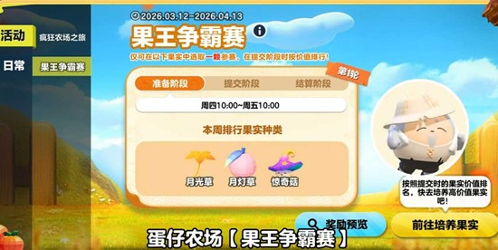 活动期间,登录疯狂农场,精心耕耘你的参赛果实,提升果实品质与等级,即可报名参与果王争霸赛的各轮评选!