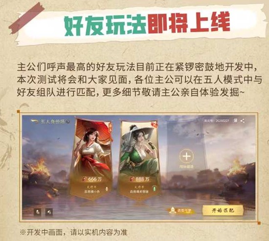 3月18日起,主公们可以在五人模式中与好友组队进行匹配,告别单排的孤独,体验与好友并肩作战的策略乐趣!更多组队玩法的细节与惊喜,等待各位主公亲自进入游戏体验发掘。