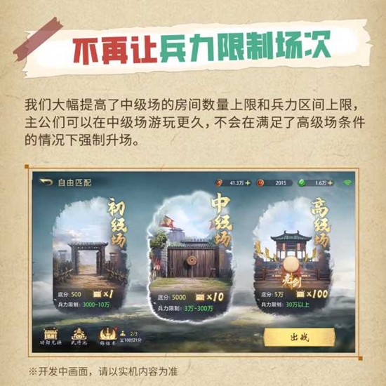 告别强制升场:不想去高级场的主公可以继续留在中级场爽快玩耍,不再因满足高级场条件而被强制升场,真正实现"高低场次轻松玩"!