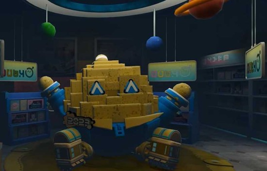 蛋仔派对玩具屋版本以“好蛋来超市”为背景,首次完整开放了其中的玩具区域。这次更新的美术风格与以往明亮欢快的基调有所不同,采用了低饱和度的光影与高对比度的阴影设计,整体氛围转向了悬疑与沉浸式探索。区域入口处立着一只巨大的积木蛋仔,其标准微笑表情在昏暗环境和冷色调灯光的映衬下,呈现出一种诡谲的视觉观感。