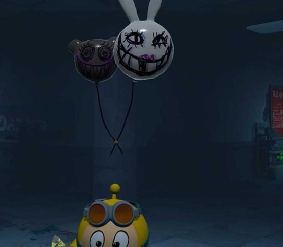 新增的敌对单位“熊兔气球”是本版本的核心设计亮点。该单位由熊头和兔头双气球构成,是首个在天花板固定轨道上位移的敌人。常态下它会沿顶部轨道静默滑行,一旦侦测到玩家便会自动锁定其正上方的位置,并伴随轻微的气流声效及表皮纹理的躁动变化,形成明确的追踪提示。其行为模式兼顾了隐蔽性与可预判性,为玩家的战术应对提供了操作空间。