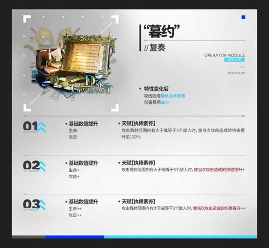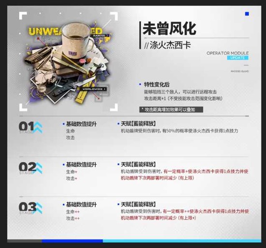阶段02:生命与攻击大幅提升,获得技力概率提升,并使机动盾牌下次再部署时间减少(有上限)。