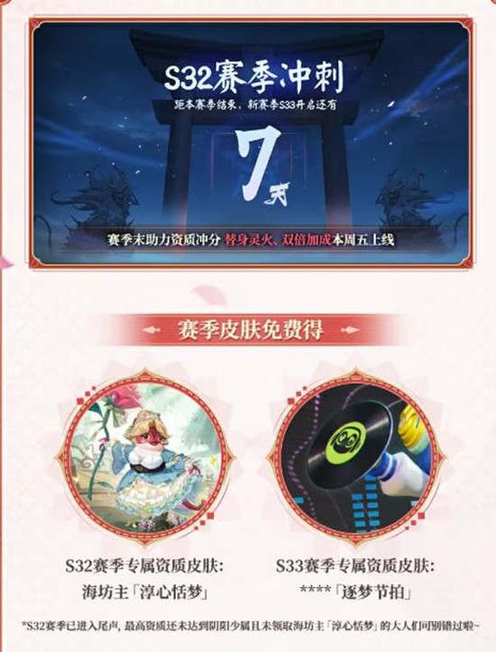 随着S33赛季临近,S32赛季进入最后冲刺阶段(倒计时约7天)。S32赛季专属资质皮肤——海坊主「淳心恬梦」即将下架,尚未达到资质要求的大人请抓紧时间获取。