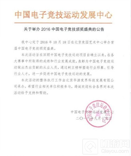 据悉,首届“中国电子竞技颁奖盛典”将于2016年10月18日在北京竞园艺术中心盛大举行。本次颁奖盛典由中华全国体育总会独家授权成立的中国电子竞技运动发展中心发起,由北京华游竞界科技发展有限公司承办,其目的是感恩过往,表彰现在,激励未来。