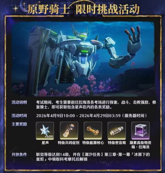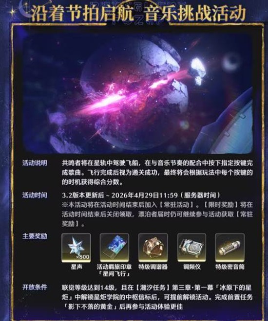 新版本首推「沿着节拍启航」音乐挑战活动,漂泊者将跟随律动完成特定挑战,赢取星声、特级调谐器、特级密音筒等养成素材。同时,「原野骑士」限时挑战活动同步开启,考验战斗技巧与阵容搭配,通关可获星声、特级共鸣促剂等珍贵奖励。