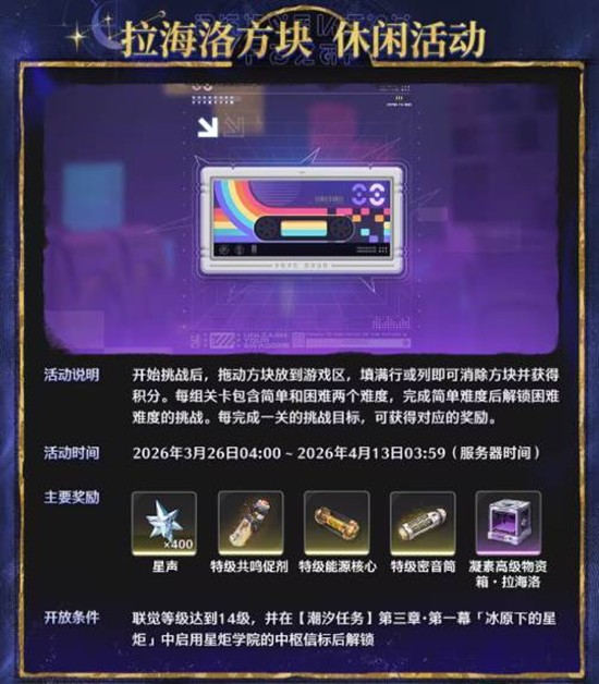 版本期间,《鸣潮》为偏好轻松体验的漂泊者准备了多款趣味活动。「拉海洛方块」休闲活动带来全新方块消除玩法,完成挑战可获得星声、特级共鸣促剂、高级能源核心等奖励。「超高效!餐能中心补完计划!」则将经营元素融入游戏,漂泊者需管理餐能中心运营,获取星声、高级共鸣促剂、高级能源核心等实用道具。