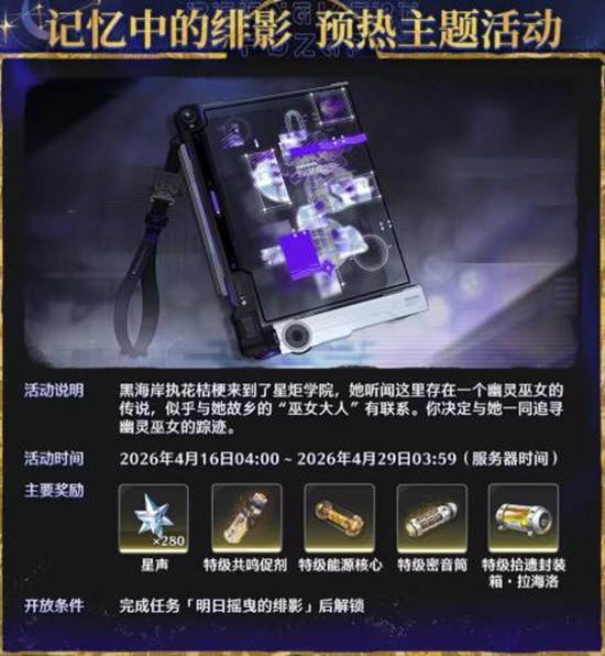 此外,「记忆中的绯影」预热主题活动将带领漂泊者探索角色背后的故事,完成任务可领取星声、特级共鸣促剂、特级密音筒等奖励。而「诸星密语」作为常驻活动,提供星声、科摩耶的纪录(头像装饰)、高级共鸣促剂等长期可获取的资源。