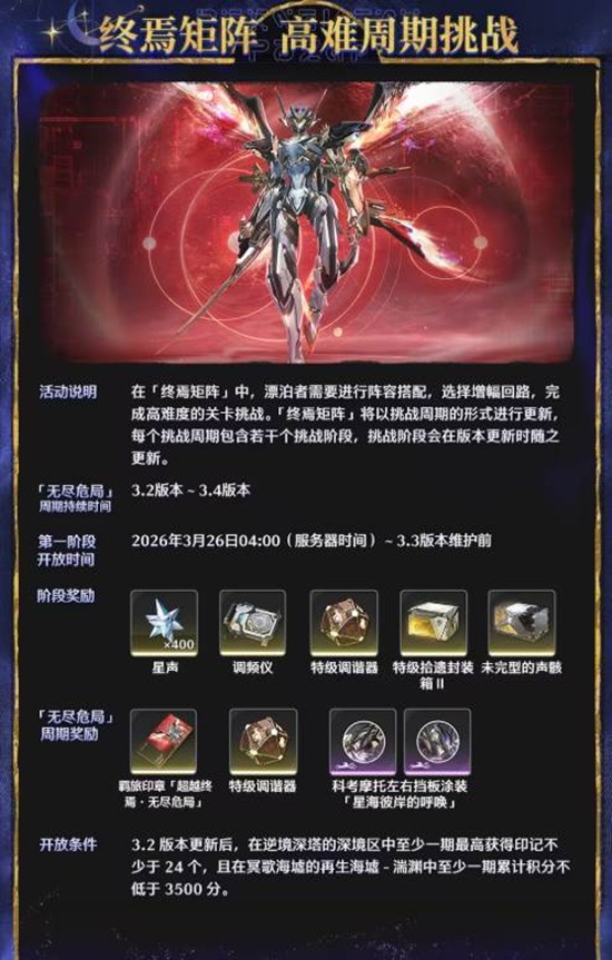 针对追求极限的漂泊者,「终焉矩阵」高难周期挑战重磅回归。该玩法以周期形式更新,每个挑战周期包含若干挑战阶段,完成高难度关卡可获取星声、调频仪、特级拾遗封装**等稀有资源,更有专属周期奖励等待解锁。