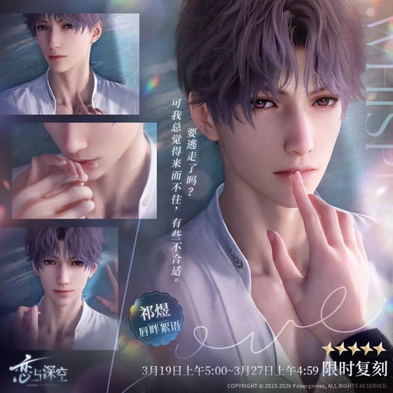恋与深空宣布,「眸光映照处」系列五星思念UP许愿将于明日(3月19日)上午5:00正式开启复刻,持续至3月27日上午4:59结束。春色明媚之际,沈星回、黎深、祁煜三位男主的限定五星思念将限时回归,占五星获取概率的75%。