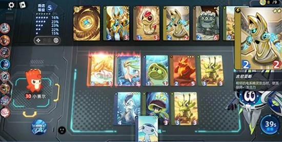 备战结束后,系统会随机从其他7名玩家里锁定一个对手,双方进入战斗阶段。战斗是全自动的,双方的卡牌会按照顺序依次出手,玩家不需要手动操作,只能看着打。战斗会一直持续到某一方的卡牌全部退场为止,存活的一方获胜。输掉的那方会根据对方场上还剩多少张牌来扣除小小精灵的血量,剩的牌越多,扣的血就越多。血量扣到0就直接淘汰,退出本局游戏。