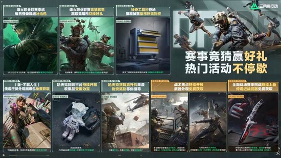赛事竞猜兑好礼:参与烽火职业联赛赛事竞猜,赢取竞猜币。竞猜币可在专属商店兑换限定头像框、枪械皮肤、哈夫币礼包等丰厚奖励,看比赛拿福利两不误!