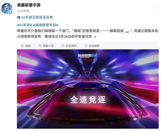 英雄联盟手游今日正式官宣,竞速主题版本即将重磅来袭!这场速度与激情的盛宴定于3月26日通过开发者日志的形式正式揭晓,届时将为召唤师们带来满满惊喜。