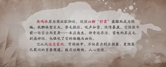 为了给大家带来第一手情报,刀妹已前往焦鸣林实地踩点(差点被凶狮"狞雷"一掌拍飞)。从发回的前线视频可以看到,这片位于巴蜀古道的密林险境阴森诡异,巨型凶狮"狞雷"身形庞大、雷霆环绕,招式凶猛且范围极广,需要团队成员密切配合、灵活走位才能将其制服。