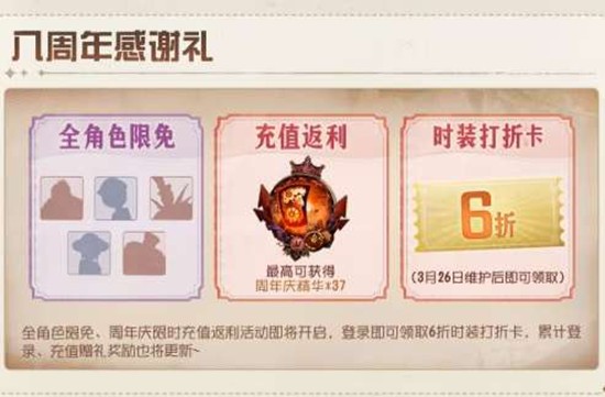 为庆祝八周年重点版本上线,活动期间登录游戏即可通过邮件领取限定福利包,助力访客们畅快选购心仪时装: