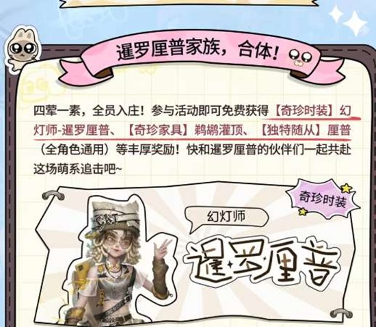 四荤一素,全员入庄!网易首款1V4非对称竞技手游《第五人格》与超人气IP暹罗厘普的联动活动「暹罗厘普家族,合体!」正式官宣,将于4月2日维护后至5月2日23点59分限时开启。活动期间参与萌趣盲盒玩法,即可免费获取【奇珍时装】幻灯师-暹罗厘普、限定家具及全求生者通用独特随从等丰厚奖励。