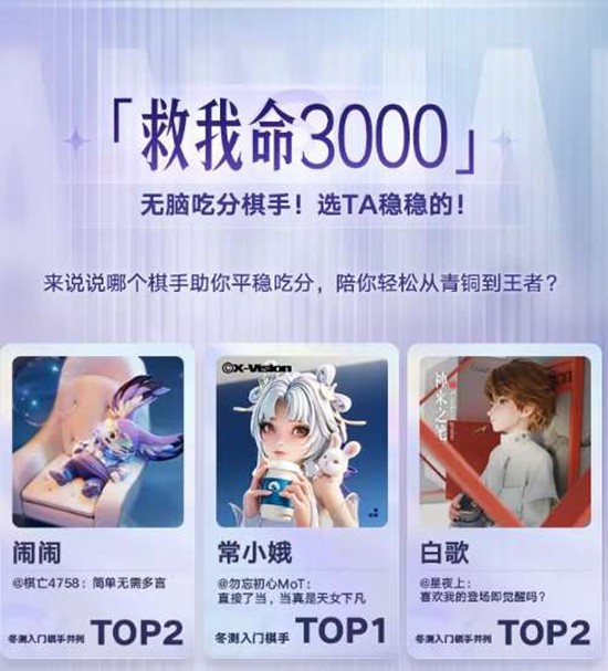 首期榜单大揭晓活动已于3月24日开启,围绕"救我命3000"无脑吃分棋手、"低阶战神"无双锋芒英雄、"邪修绝杀"刁钻姿势三大主题展开评选。
