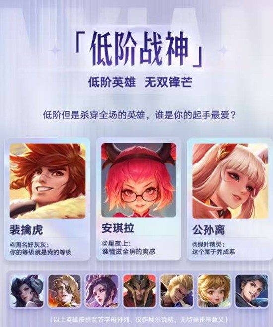 "低阶战神"榜单则聚焦于低阶但杀穿全场的英雄,裴擒虎、安琪拉、公孙离等英雄凭借其在前期的强势表现成为玩家起手最爱。其中裴擒虎"你的等级就是我的等级"的机制让他节奏飞快,安琪拉的全屏爽感与公孙离的养成系打法也各具特色。