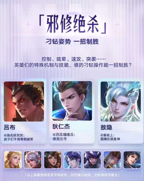"邪修绝杀"榜关注控制、眩晕、速攻、突袭等特殊机制,吕布"孩子们不用等我破军"、狄仁杰"喂我古币"、敖隐"图腾在就是神"等刁钻操作成为一招制胜的关键。