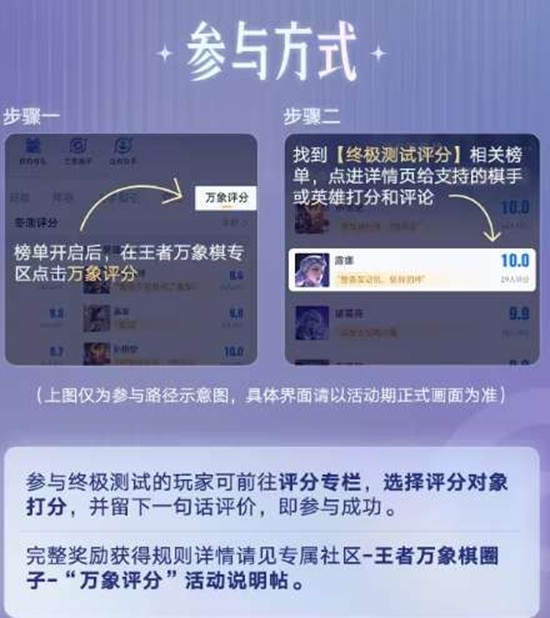 活动分两批进行,首批榜单于3月24日开启、4月15日结算,第二批榜单于4月15日开启、5月20日结算。参与方式为前往王者万象棋专属社区点击"万象评分",选择支持的棋手或英雄打分并留下一句话评价即算成功。参与活动有机会获得京东E卡与官方展示机会,优质评价还将获得官方推荐展示。快前往社区为你喜爱的英雄与棋手打