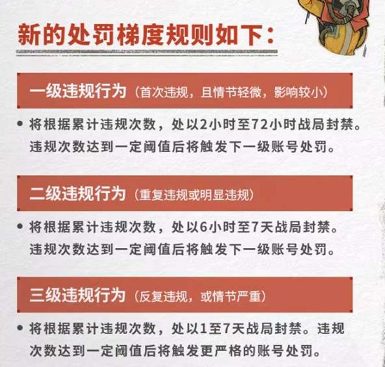 处罚措施:根据累计违规次数,处以6小时至7天战局封禁。