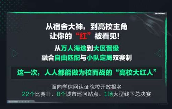 4月1日起,登录《三角洲行动》官网,进入赛事中心完成高校认证,从万人海选中脱颖而出,让你的"红"被看见!