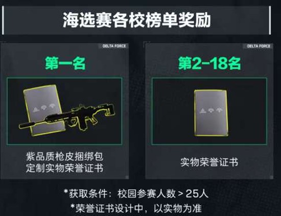 此外,各高校榜单第1名将获得紫品质枪皮捆绑包+定制实物荣誉证书,第2-18名获得实物荣誉证书。