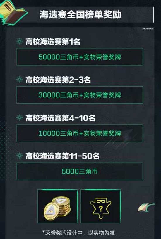 海选赛全国榜单:第1名可获得50000三角币+实物荣誉奖牌,第2-3名30000三角币+奖牌,第4-10名10000三角币+奖牌,第11-50名5000三角币。