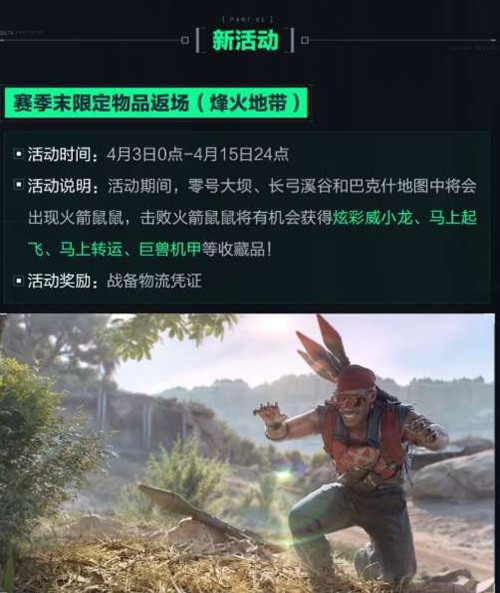 活动期间,零号大坝、长弓溪谷和巴克什地图中将会出现火箭鼠鼠,击败它们即有机会获得炫彩威小龙、马上起飞、马上转运、巨兽机甲等稀有收藏品!同时可获得战备物流凭证。