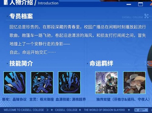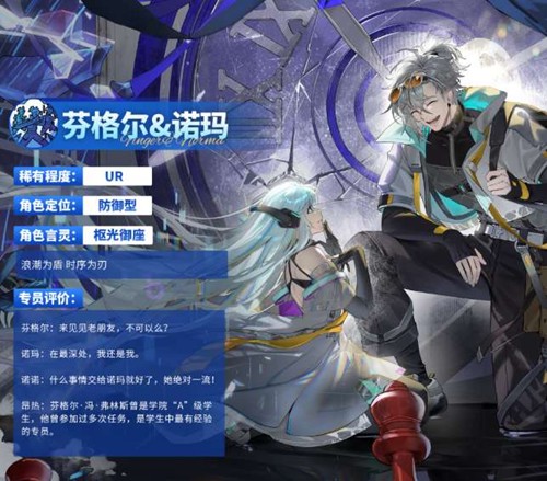 「芬格尔&诺玛」是游戏中首次以双角色共生形式登场的UR伙伴。根据专员档案记载,芬格尔·冯·弗林斯曾是卡塞尔学院"A"级学生,看似废柴实则经验丰富的他,在一次"冒失撞上安静身影"的意外中,与学院超级人工智能诺玛产生了命运。