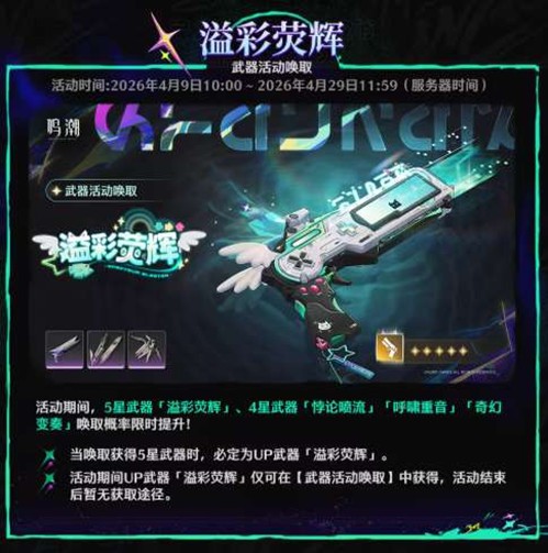 【溢彩荧辉】:5星武器「溢彩荧辉」UP(赞妮专武),4星武器「悖论喷流」「呼啸重音」「奇幻变奏」概率提升。