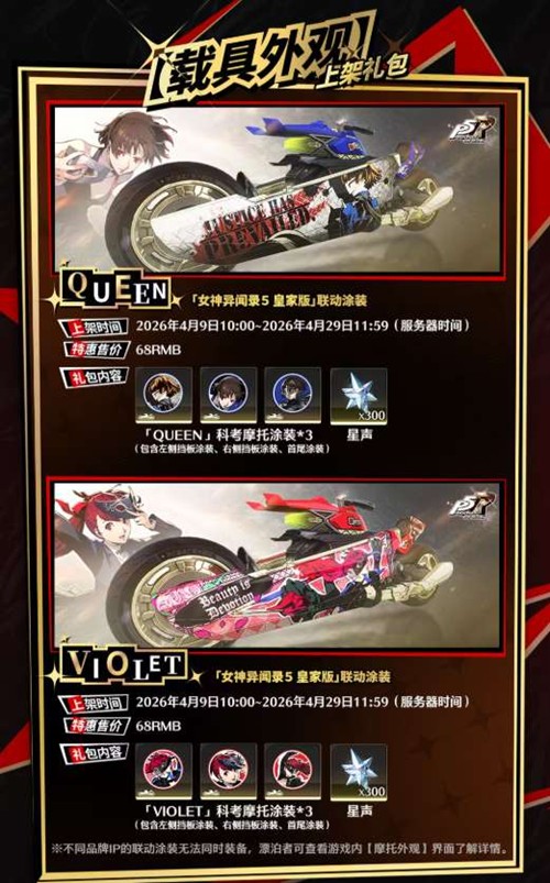 4月9日10:00至4月29日11:59,《女神异闻录5皇家版》联动载具外观礼包限时开售: