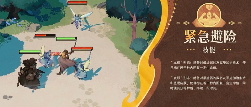 另一个主动技能“紧急避险”,在本相下仅作用于当前生命值最低的友方单位,执行单体治疗。变形后则会扩展为多目标治疗,并额外赋予护盾效果。该技能每次使用需要消耗1点火源,虽然有资源限制,但综合生存保障能力跃升非常明显,即使赫普自身承担了大量伤害,也能同步维系后排关键角色的站场时间。当火源点数耗尽时,赫普会自动回归本相,并对周身敌人发动一次范围反伤,同时附加致盲效果,致盲期间敌方单位的命中率会显著下降,能有效缓解我方脆皮角色的压力。
