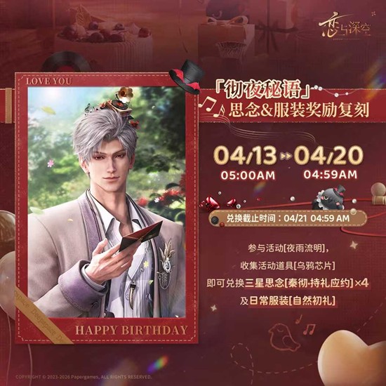 4月13日上午5:00,让我们一同踏入「肆雨照夜」,在雨声与心跳交织的N109区,为秦彻献上最特别的生日祝福,见证这场只属于你们两个人的危险又甜蜜的独家记忆!