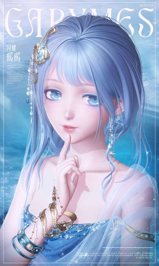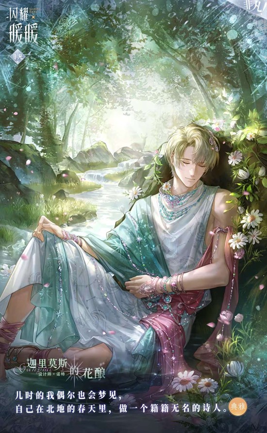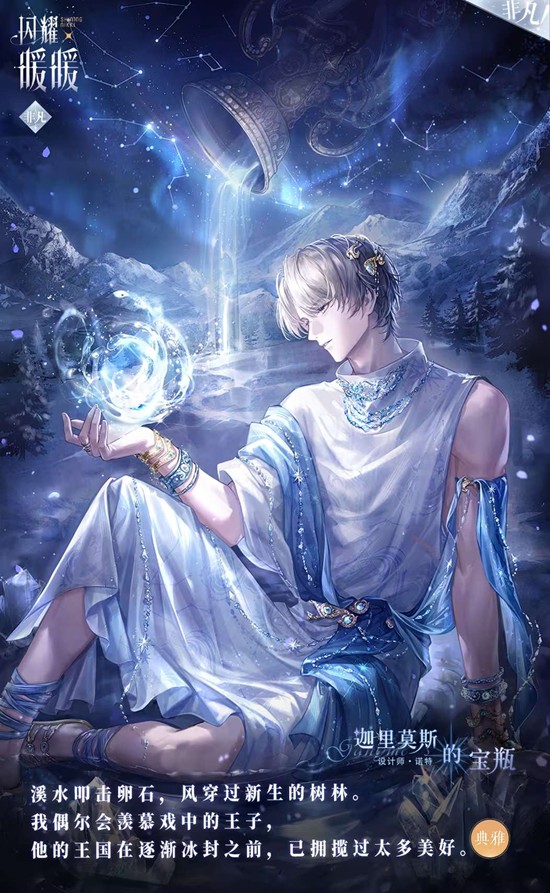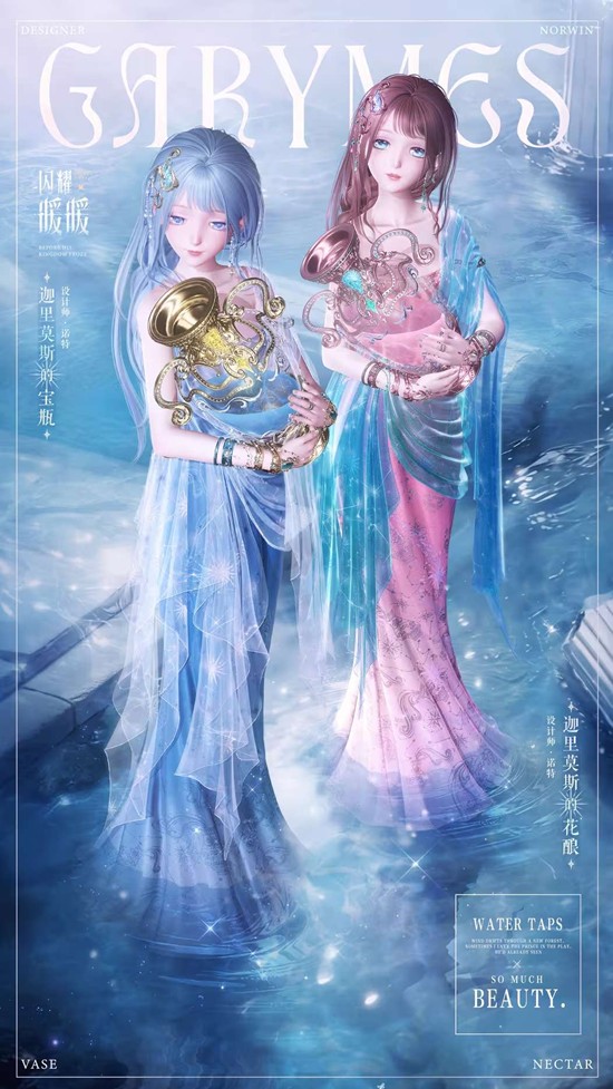 套装核心意象源于「生命之弦」与「无瑕宝瓶」的神话隐喻。设计师构建了一个关于时光回溯与虔敬祈愿的叙事:宝瓶作为生命溪泉的源头,承载着人类对永续与重生的渴望。这一设定与北地冰封王国的背景深度融合,将自然意象(春天、溪泉)与政治隐喻(硝烟、王庭)交织,最终指向「更温热的暖春」这一超越现实的美好愿景。