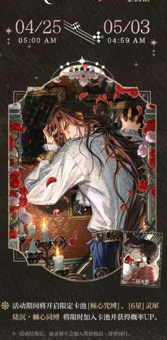 光与夜之恋「玫瑰浮漪」限时活动4月25日开启:与陆沉共探童话秘境,解锁限定灵犀与专属奖励!活动「玫瑰浮漪」将于4月25日05:00正式开放,持续至5月3日04:59,兑换商店则延至5月4日04:59关闭。这一时间跨度覆盖两个完整周末,为玩家预留充足的参与窗口。