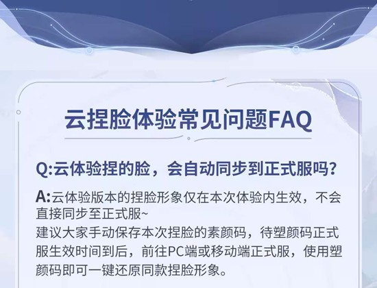 云体验捏脸形象不会自动同步至正式服,玩家需手动保存素颜码。待4月17日正式服上线后,在PC端或移动端输入塑颜码即可一键还原同款形象。塑颜码生效存在延迟,云体验生成的塑颜码需等待24小时左右才能在正式服使用,页面左下角会标注具体生效时间。反向亦不互通,正式服的塑颜码无法在本次云体验版本中使用。